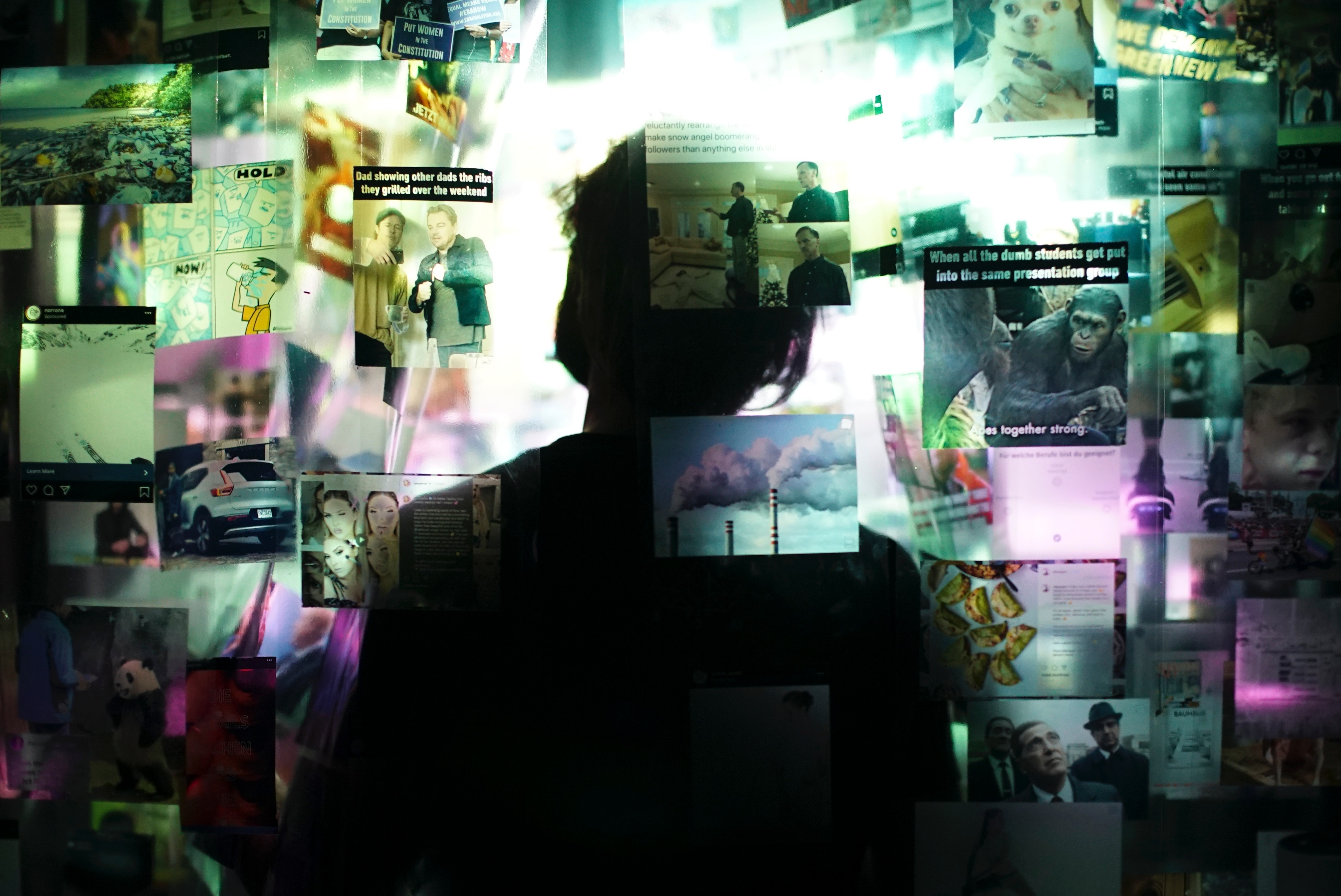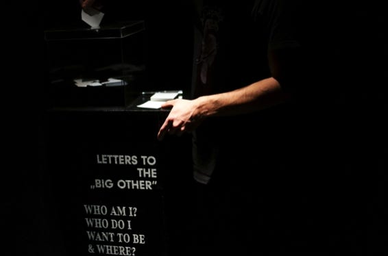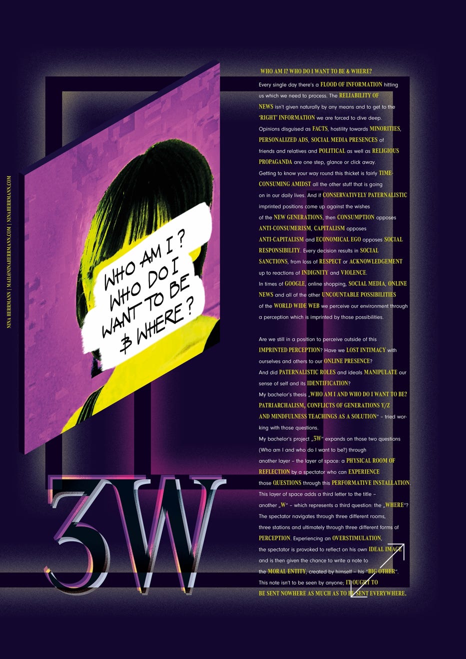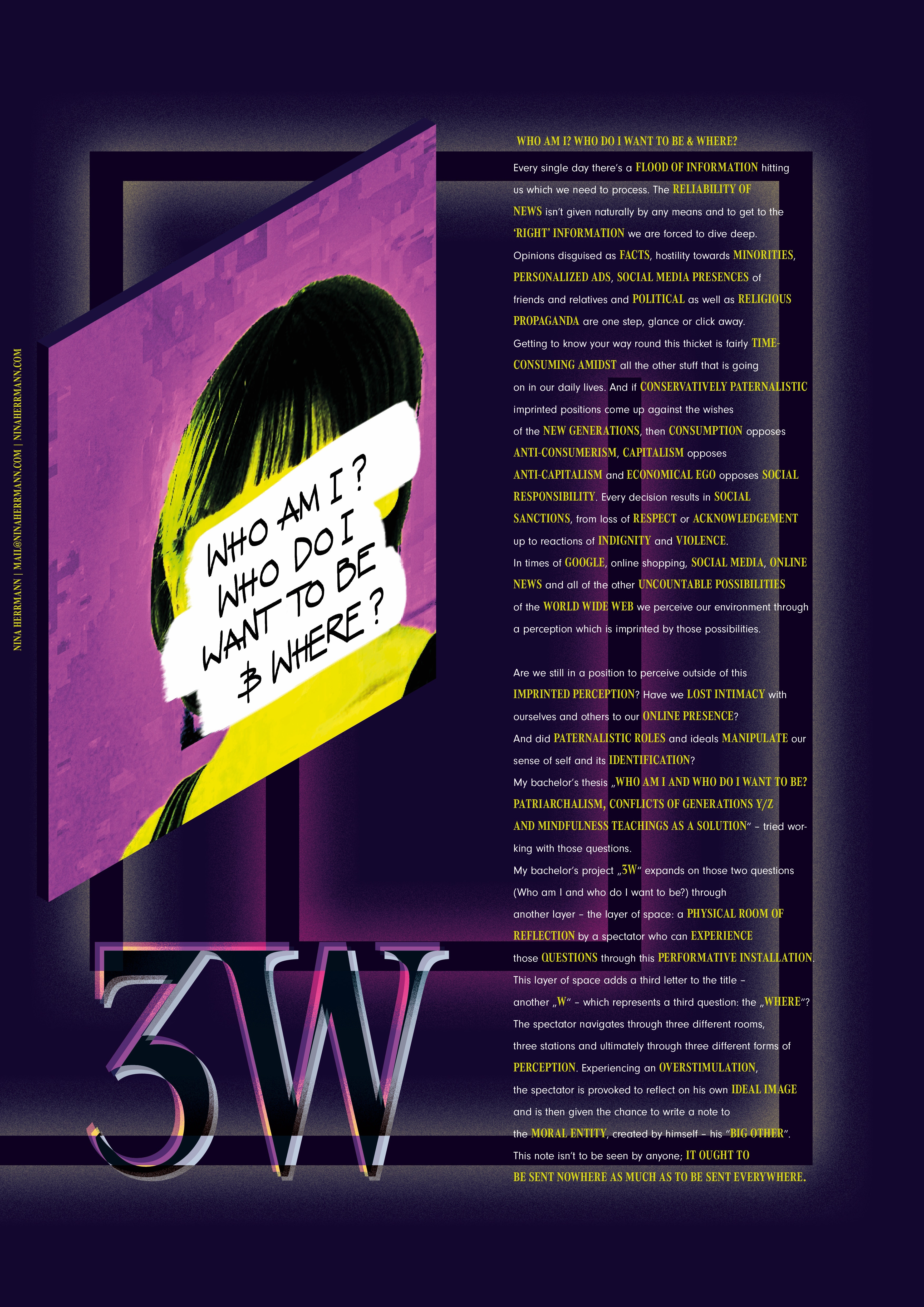 Mein Thesis begleitendes Bachelorprojekt „3W. Who am I? Who do I want to be and where?” soll diese nun um eine weitere „W-Frage“ dem „Wo“ erweitern, sie auf den physischen Raum der Reflektion durch einen Betrachter erweitern und in Form einer performativen Installation erlebbar machen. „3W“ soll den Betrachter durch drei Räume, drei Stationen und durch drei unterschiedliche Formen der Wahrnehmung navigieren. Der Betrachter begibt sich zunächst auf eine Expedition durch das Dickicht der multimedialen Reizüberflutung, dann in einen Raum der Selbstwahrnehmung und Selbstidentifizierung bis zum „Großen Anderen“ – seiner selbst kreierten moralischen Instanz. Dort kann er aufgeworfenen Fragen, Wünsche oder auch Gedanken aufschreiben. Diesen Aufschrieb wirft er dann in eine durchsichtige, mit Tinte befüllte Kiste. Die Tinte lässt das Festgehaltene verschwinden und richtet somit die geschriebene Nachricht an den Betrachter selbst. „3W“ soll einen Perspektivenwechsel des Betrachters auf sich selbst und seine Umgebung forcieren und so Bewusstsein schaffen.